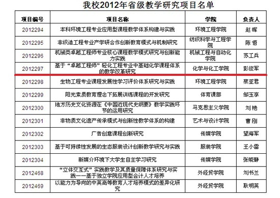 近日,省教育厅下发了《关于公布2012年高等学校省级教学研究项目的通知》。在学校申报的基础上,经专家评审,省教育厅审核,我院彭俊军老师申报的“基于卓越工程师轻化工程专业中基础化学课程体系的教学改革研究”成功获批。在今年的申报中,全校共获批了13项。