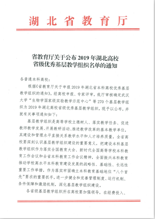 根据《省教育厅关于申报2019年湖北省本科高校优秀基层教学组织的通知》和学校部署,学院组织积极申报,经过省教育厅评审,学院轻化工程教研室被评为2019年湖北高校省级优秀基层教学组织。