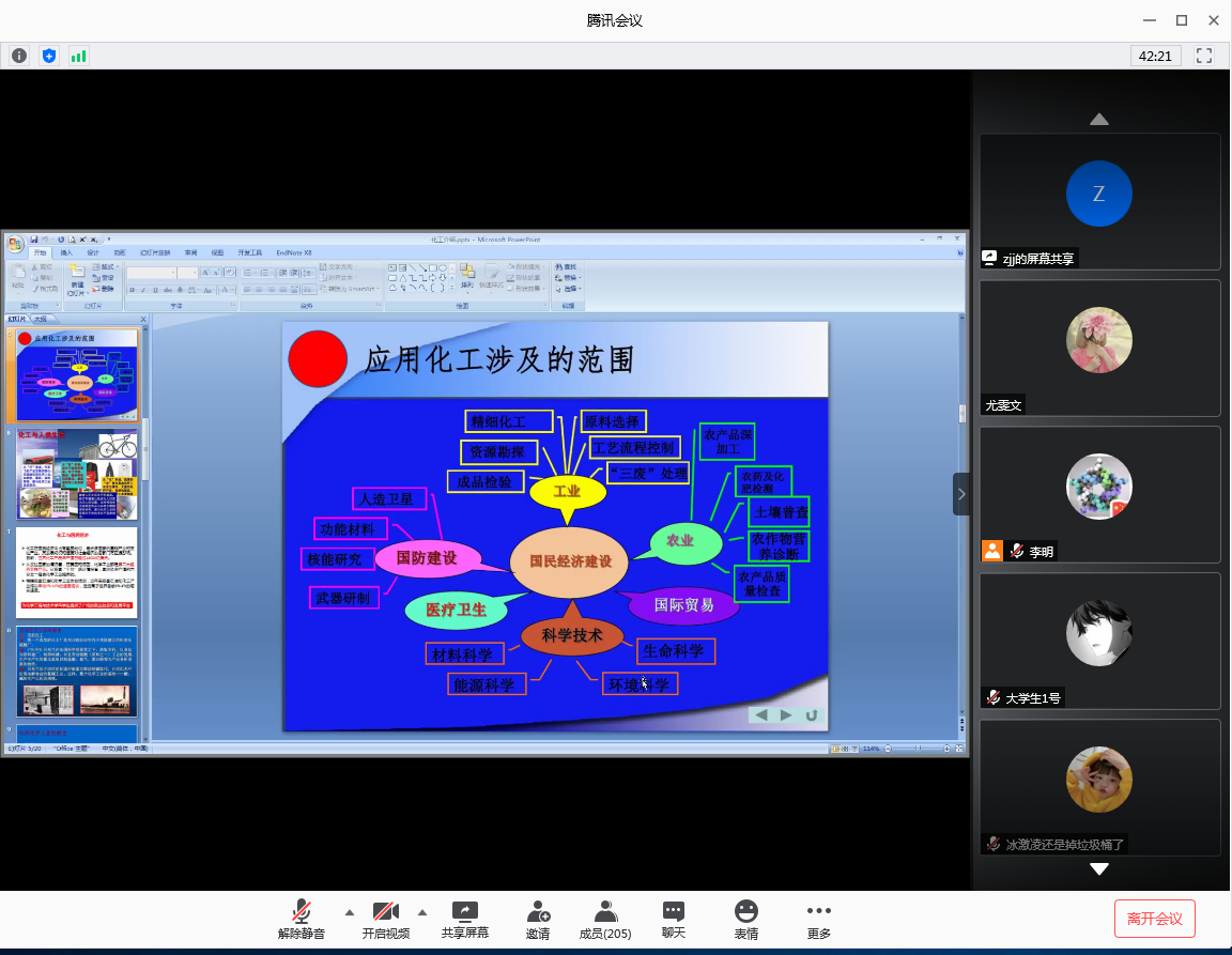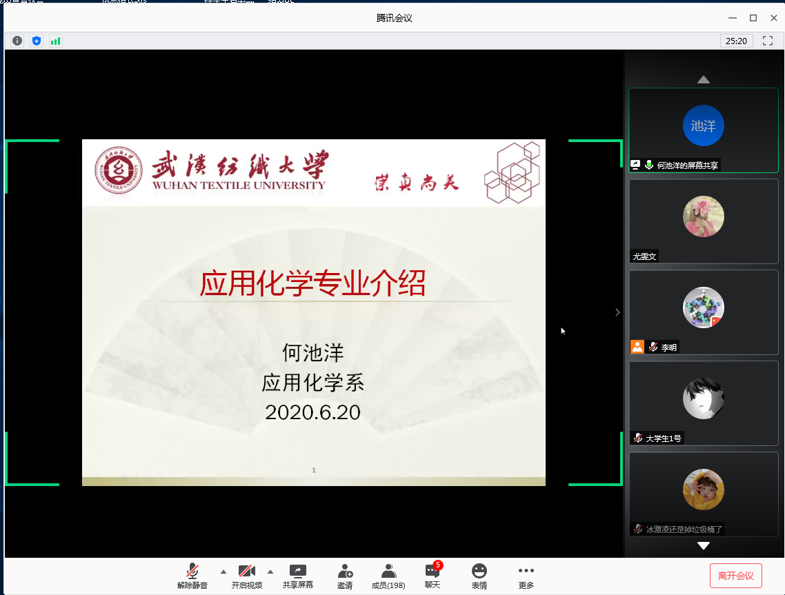 为了更形象地说明,权衡教授播放了一个小视频来进行面料处理前后的直观对比,展示了轻化专业在纤维及其材料特殊功能运用上的技术力量;何池洋教授介绍了应化专业的精细化学品、工业分析两个方向,展示了学科支撑、学科研究平台等详细信息;朱君江教授通过大量的例证,介绍化工与日常生活、国民经济的密切关系,并介绍了世界五百强和国内排名前十的化工行业企业;李明副院长以“高素质应用型创新人才”培养目标理念讲解入手,介绍资源专业在化学化工、材料、环境、供应链等方面的融合发展,介绍了培养目标的课程支撑、课程体系等。