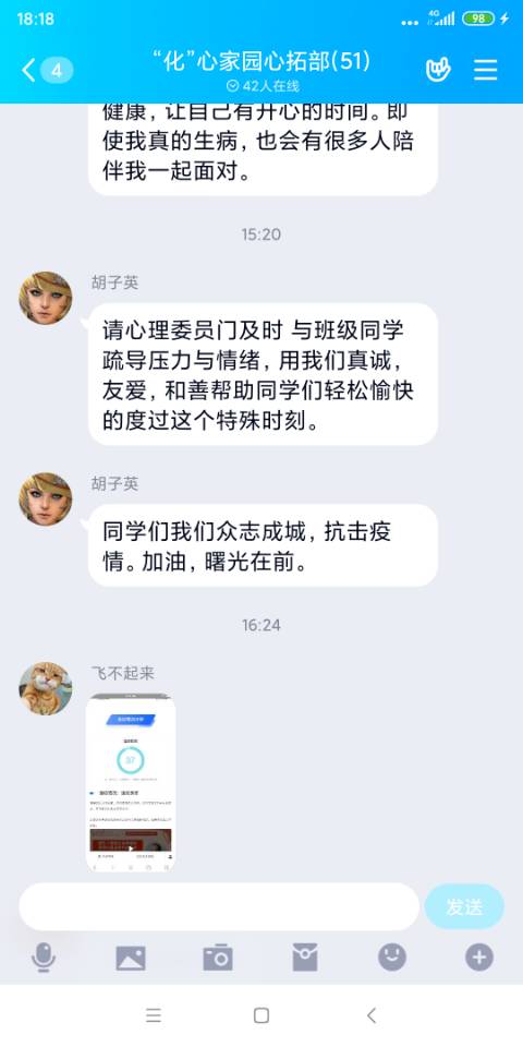 活动开展依托“化”心家园心拓部QQ群平台,以全院心理委员为培训对象。活动伊始,学院心理健康联络员胡子英老师带领大家通过《公众抗疫心态自检自助表》自测链接,进行了一个简单的2分钟心理小测试,让大家快速了解个人在疫情下的心理适应状况。
