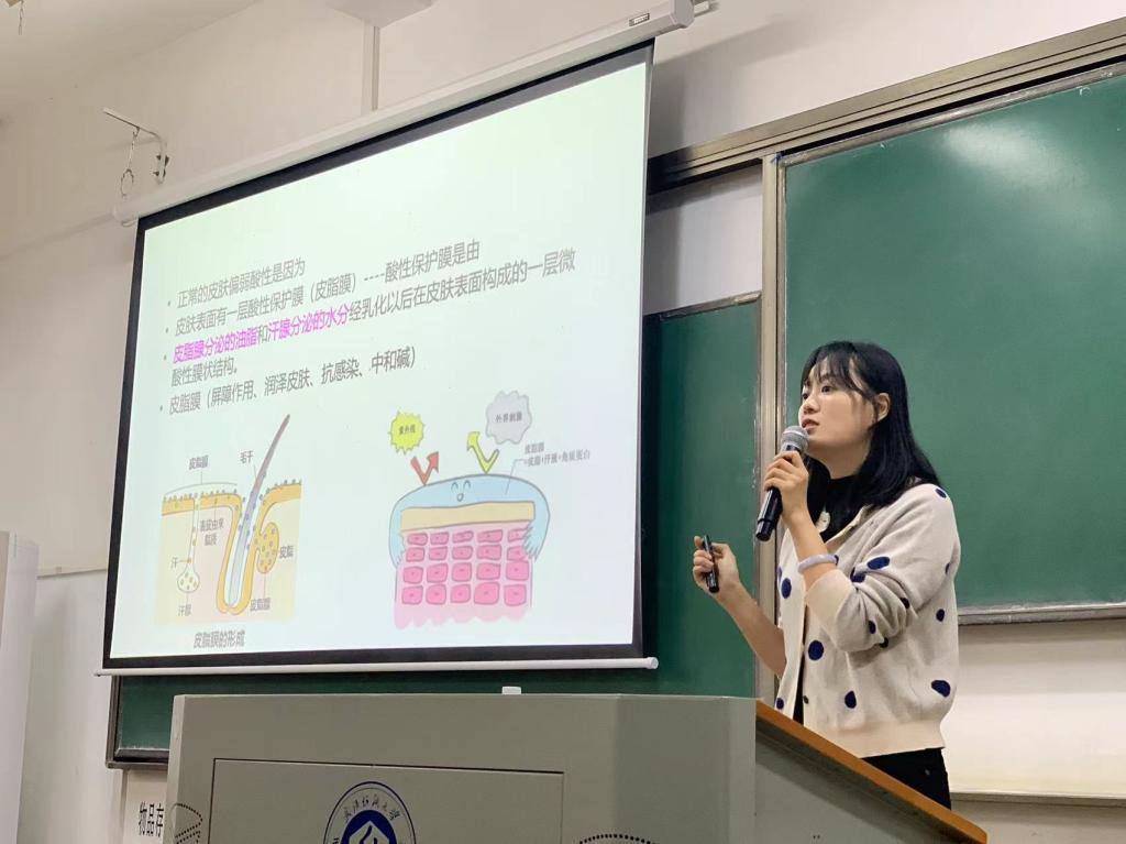 此次讲座共有四个模块,分别是皮肤概括,基本结构,皮肤微生态,皮肤免疫。谢君博士准备了丰富的实际案例,深入浅出地将与化妆品专业相关的皮肤科知识给大家进行了介绍,既激发了学生们的学习兴趣,又便于理解,还补充了皮肤疾病与化妆品方面的应用知识,贴和同学们的实际生活。此外,为了充分调动同学们的积极性,谢君博士和同学们一起交流了平时的护肤方法及一些化妆常识,向同学们推荐了几款国产护肤佳品,还对几个皮肤问题对症下药,强调保湿剂的重要性,令同学们受益匪浅。