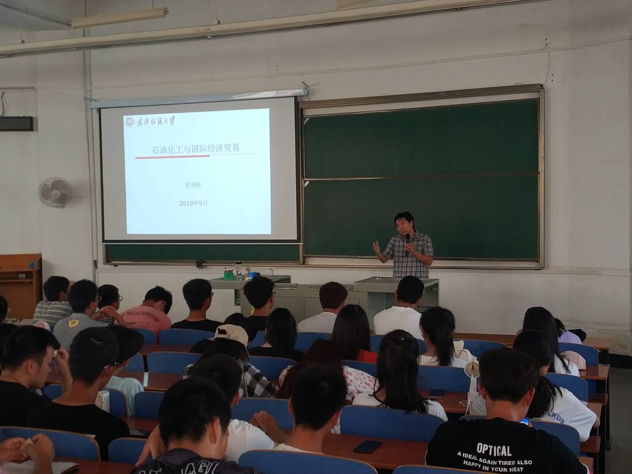 9月30日上午10点,3号教学楼T201教室座无虚席,刚刚荣获“庆祝中华人民共和国成立70周年”纪念章的夏明桂教授正在给学生讲述题为《石油化工与国际经济贸易》的主题讲座。