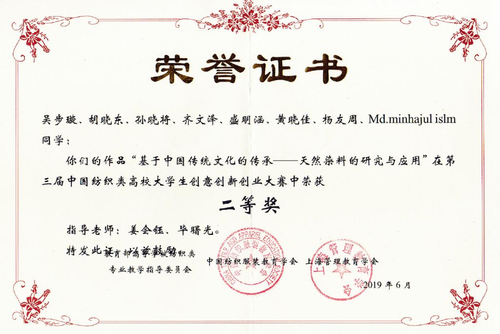 5月29日至30日,由教育部高等学校纺织类专业教学指导委员会、中国纺织服装教育学会、上海管理教育学会联合主办,天津工业大学经济与管理学院承办的第三届中国纺织类高校大学生创意创新创业大赛全国总决赛在天津工业大学圆满落幕。经过激烈的比拼,由我院姜会钰副院长与毕曙光老师共同指导,研究生胡晓东同学、轻化11702班吴步璇同学与孙晓将同学、轻化11801班黄晓佳同学等组成的团队参赛项目“基于中国传统文化的传承-天然染料的研究与应用”荣获二等奖。