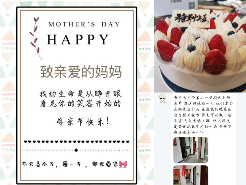同学们积极响应号召,给妈妈节日的问候,向妈妈表达自己的爱。有的是为妈妈做一次晚餐,有的送给妈妈一束馨香的鲜花,有的准备一个小蛋糕来表达对妈妈的爱和感恩,有的把家里打扫的干干净净,为妈妈做一点自己力所能及的事,还有的直接给妈妈发出祝福和感恩的消息,话语虽然朴实简洁,却饱含深情和爱。化学类11907班高哲作诗一首,献给母亲:“十月怀胎劳身心,慈母视子胜千金;呕心沥血为儿欣,青丝白发度光阴;世间唯有母最亲,子女归家问苦辛;儿女应懂母辛勤,心中常记慈母吟。”不少同学选择在母亲节这一天进行一年一度的合影纪念,“每年母亲节,我都会和妈妈合影拍照。翻看一张张的照片,我们已长大,妈妈却已青春不在,只剩下为我们奔波操劳而留下的皱纹和难以回报的母爱。心酸的同时让我更加理解父母,更加珍惜自己幸福生活,感恩现在所拥有的一切。”