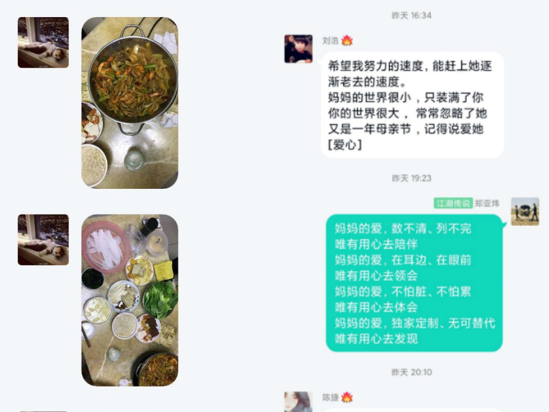 一天的活动结束后,同学们纷纷在群里分享了在这一天与妈妈相处的点滴,交流以各种各样的方式表达着爱的感受,谁言寸草心,报得三春晖。大家纷纷表示不能忘记妈妈们为我们付出爱和精力的每一天。我们会好好爱护我们自己,也会好好爱护守护我们的妈妈们。看到大家的分享,所有人都感动着,也行动着。