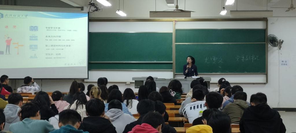 在崇礼楼210教室举行团课,学院副书记尤雯文以“勤奋+自律,制成青春不迷茫的配方”为题,和2020级同学探讨大学生涯规划和大学生的底线思维红线意识。