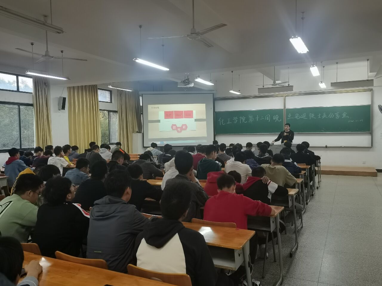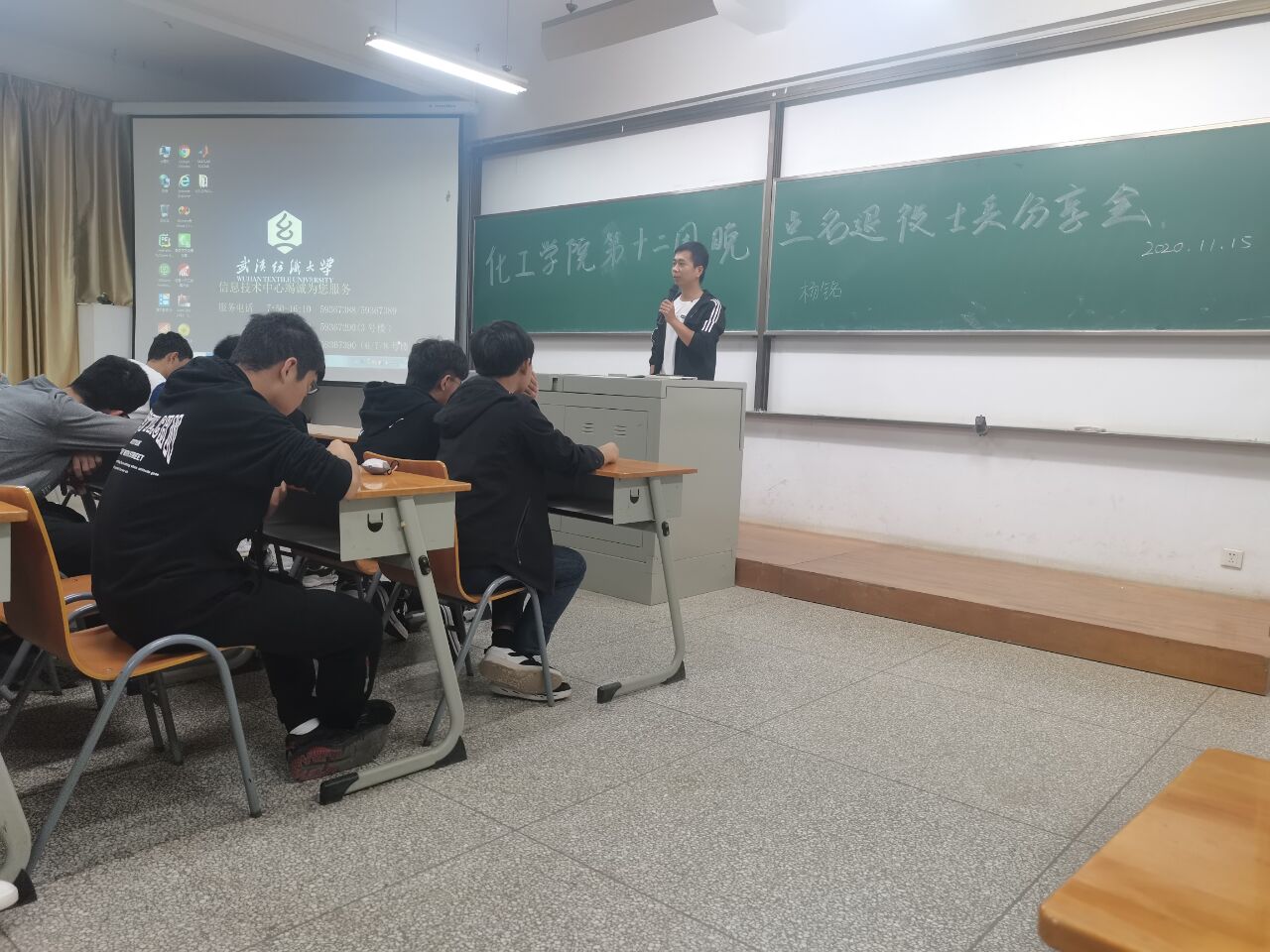 在崇礼楼210教室,开启本学期“朋辈说”系列活动第三期,退伍大学生士兵王超龙、胡富林、周成杰与2020级男生分享他们的入伍故事。