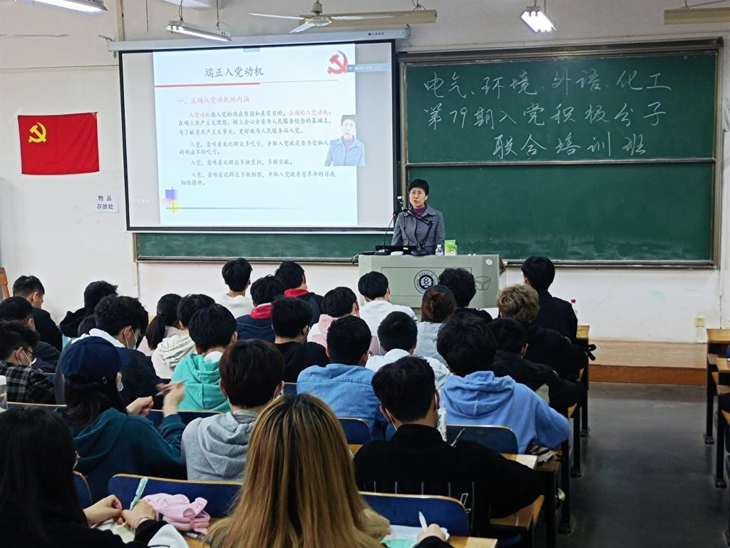 环境工程学院谢晓萍书记以“端正入党动机,争取早日加入党组织”为主题,分别从端正入党动机、按照党员要求严格要求自己和入党必须履行的手续三个方面讲解,介绍正确入党动机的内涵、不良入党动机的表现、怎么端正入党动机、共产党员的基本要求、共产党员应该具体条件及共产党员的八大义务和八大权利。谢书记指出,加入中国共产党首先要端正入党动机,按照党员标准严格要求自己,在工作学习生活中树立标兵作用。每位入党积极分子,都要有一个长期加强思想改造,长期端正入党动机的思想准备。最后,谢书记鼓励学员们尊重科学,勤奋学习,端正思想,争取早日加入党组织。