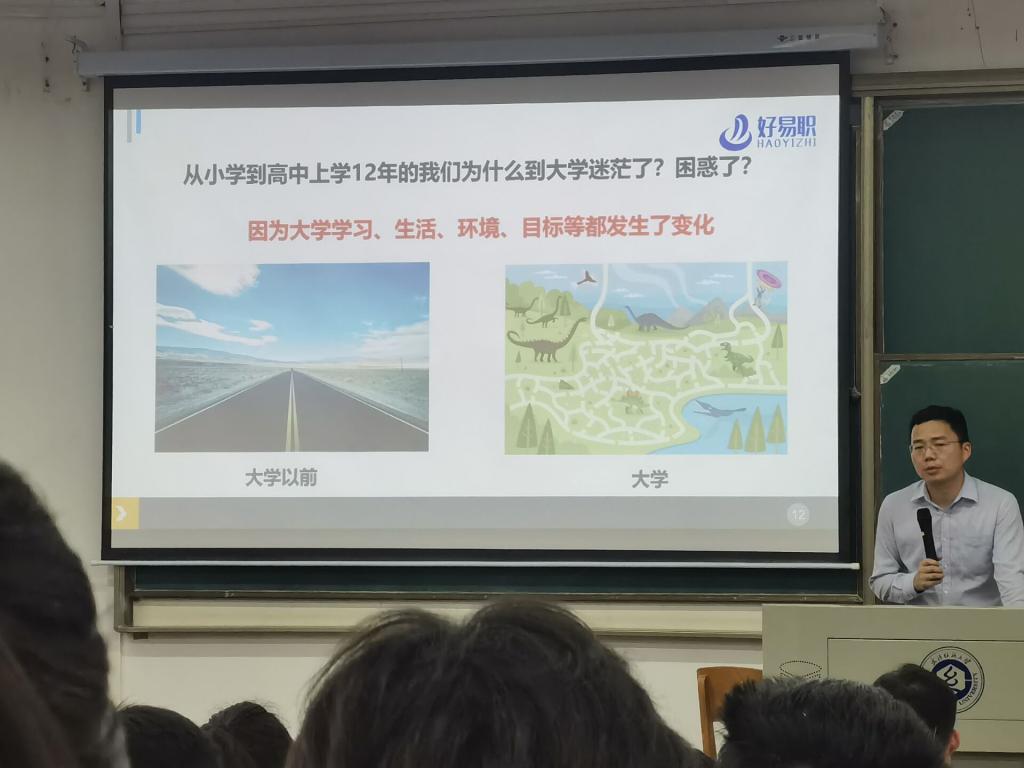 在阳光校区崇志楼T202教室开展职业生涯规划教育,好易职有限公司CEO、湖北省教育厅推荐省创新创业导师、校企业导师李建华,以《如何做好大学生和职业规划,获得更好前程》为题,给2020级全体学生详细讲解如何做好大学生职业生涯规划。