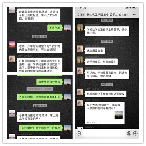 “家校联动,共育英才”一直是学院学生工作的核心理念和重点内容之一,2021级本科生迎新工作自筹备、开展以来,学院都高度重视与家长的沟通协作,通过充分而有益的家校联动,帮助新生顺利入学、尽快适应大学生活。开学前,学院建立新生家长微信群,学院书记、辅导员、副班主任专门负责管理、咨询,就新生报到注意事项进行细致介绍,对家长的担忧与疑问精准解答;将各项政策与家长们进行交流,做好常态化下防疫工作,协同学校做好入学工作。