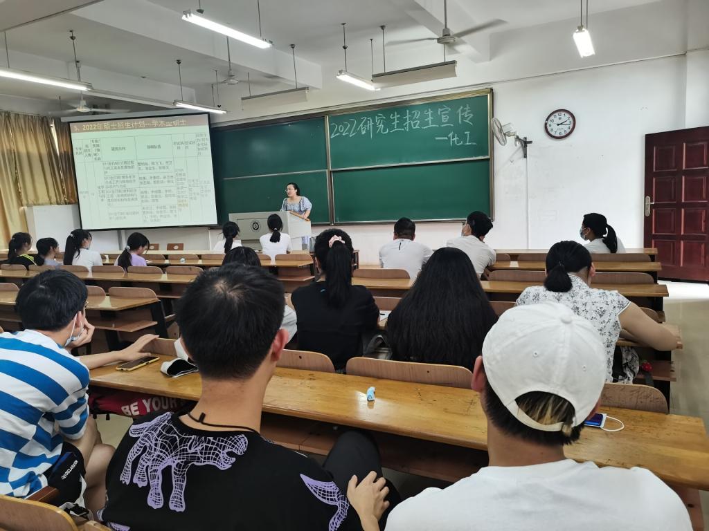 讲座分专业分别进行,崔莉教授、刘丽君教授、张然老师首先介绍了近年考研的形势,由于考研人数逐年增加,考研的竞争越来越激烈,考研难度越来越大。同学们既然下定决心考研,又已经经过了一个暑假的专心复习,更要全力以赴,坚持到底,努力上岸,不留遗憾;其次她通过数据对比列举近几年考研学生报考情况、考研学生结构组成情况,并详细介绍了学院人才培养模式和定位、研究生升学就业前景等等,用深入浅出的话语,介绍学科具体“学什么”、“将来做什么”,通过具体事例列举目前在读的和已经就业的研究生取得的成就和就业情况;第三,她详细分析了各大高校化学、化工等专业的报录比以及录取分数,强调在选择目标院校时,不盲从,坚持合适的才是最好的原则,特别是在网报确认之前,对自己的综合实力以及复习备考情况进行客观评价;最后,她分别介绍了学院夏明桂教授团队、朱君江教授团队、权衡教授团队、李晓霞教授团队、李明教授团队、杨锋教授团队等具体情况,向同学们展示团队的雄厚师资力量,条件优异的实验室设备,学术氛围良好的团队,热烈欢迎同学们报考本院。