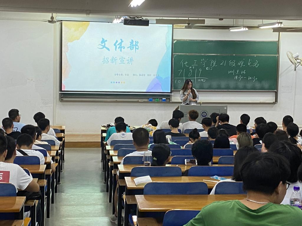 文体部部长依次向新生进行了部门介绍、活动介绍以及面试技巧,学校十佳歌手大赛、配音大赛 、新生才艺展示大赛等精彩活动一直深受同学们喜爱。体育部用精彩的图片对往期的活动进行了回顾,如学生羽毛球大赛、新生篮球杯、新生足球赛。