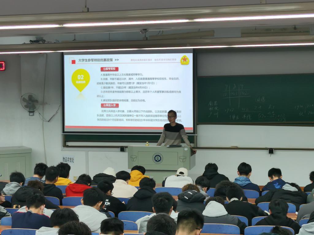谈鹏详细解读了2022年的入伍流程、参军条件、优惠政策和优抚待遇,尤其强调了毕业生参军入伍的特殊优势。学院还邀请了两名退役复学学生王权、胡富林分别就参军入伍的注意事项、军营的生活以及大学生参军入伍的重要意义与同学们作了具体的交流分享,使参会的同学们切身感受到了参军报国的光荣和伟大。