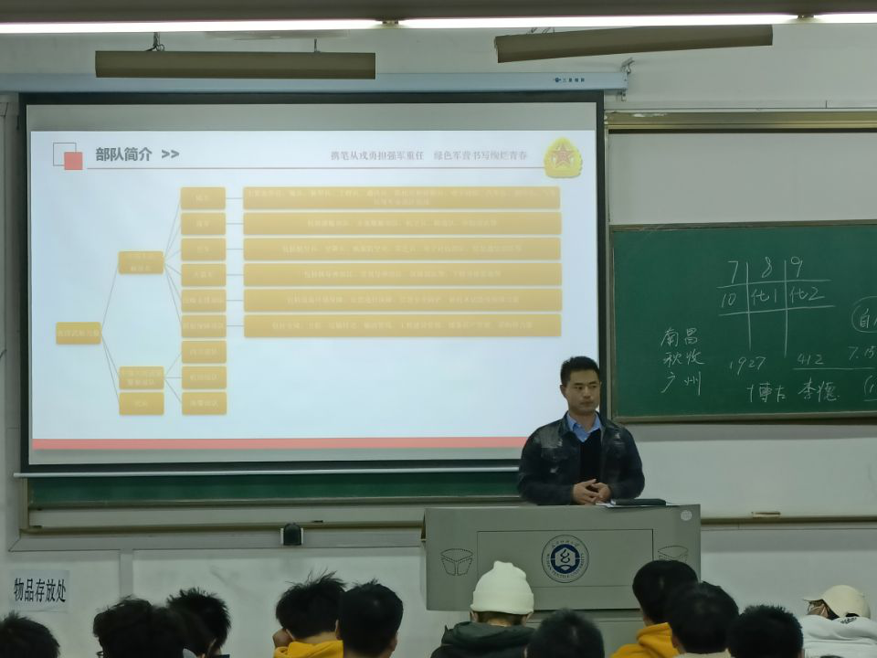 2018级退役士兵胡富林,向大家介绍了应征入伍的几个步骤,经过报名、体检、役前训练、定兵、走兵,就完成了从大学生到军人的转换。他介绍了自己所属的战略支援部队,分享自己在部队时和其他两个战友管理一个山头的的经历和感受。他表示,独守山头的时候是寂寞的,遇到军事演练,要从一个山头跑到另一个山头,相距二三十公里,有时甚至只听了几句话就要马上返回……但这种枯燥和寂寞,和一身戎装的责任相比,根本算不了什么。通过两年的军旅生活,极大地锻炼了自己的意识、耐受力,也极大地提高了自律性。