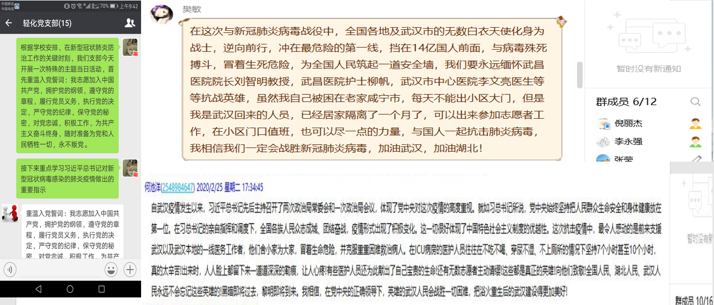 会前,学院党委书记樊敏要求各党支部要认真学习《关于在疫情防控中进一步发挥基层党组织战斗堡垒作用和党员干部先锋模范作用的工作提示》、《关于组织开展2020年2-3月份“支部主题党日”活动的通知》,结合实际情况,通过网络形式,积极开展以“发挥党员模范作用,打赢疫情阻击战”为主题的支部主题党日。