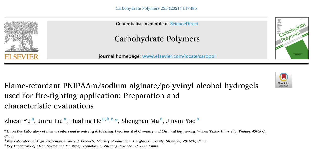 此外,研究小组在阻燃温敏水凝胶的制备以及在热防护服装领域的应用亦取得重要突破,研究工作分别以题为“Preparation and characterisation of fire-resistant PNIPAAm/SA/AgNP thermosensitive network hydrogels and laminated cotton fabric used in firefighter protective clothing”、“Thermal insulating and fire-retarding behavior of treated cotton fabrics with a novel high water-retaining hydrogel used in thermal protective clothing”先后发表在材料类知名期刊Cellulose (中科院二区,IF:4.21)。