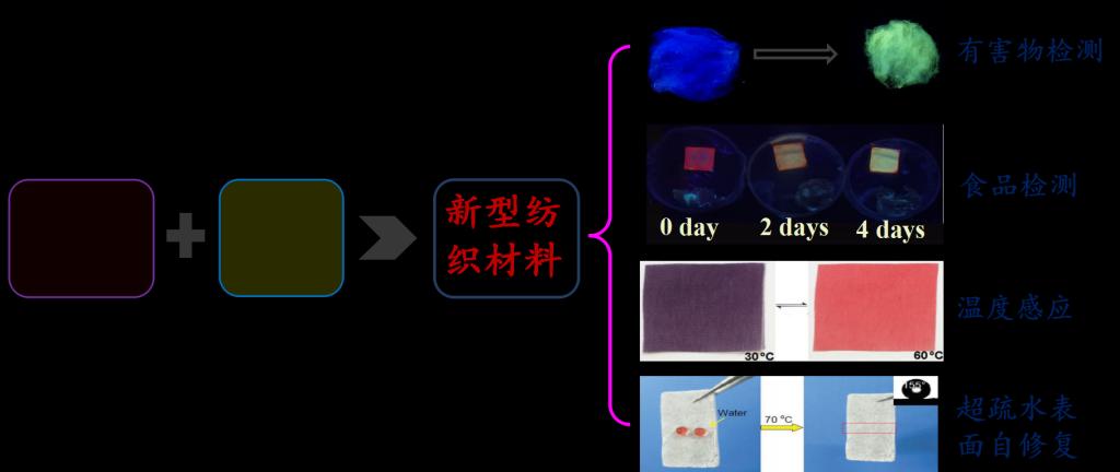 在基础研究方面,将光致发光材料与纺织材料有机结合来构筑多功能新型纺织材料,用于环境有害物检测/去除、食品检测、外界刺激智能感应及可视化自修复等领域;在应用研究方面,积极落实科研成果的市场转化,已与多个企业建立合作关系,并成功研发了水性阳离子增稠剂、新型半花菁类纺织染料、可见光控亲疏水涂层及纺织纤维自动检测仪等多项产品。至今,已主持省部级项目、教育部工程中心开放课题及校企合作项目等10余项,并在Sens. Actuators B-Chem、Chem Eng J、Dyes Pigm及Chem Commun等国际学术期刊上发表论文20余篇。