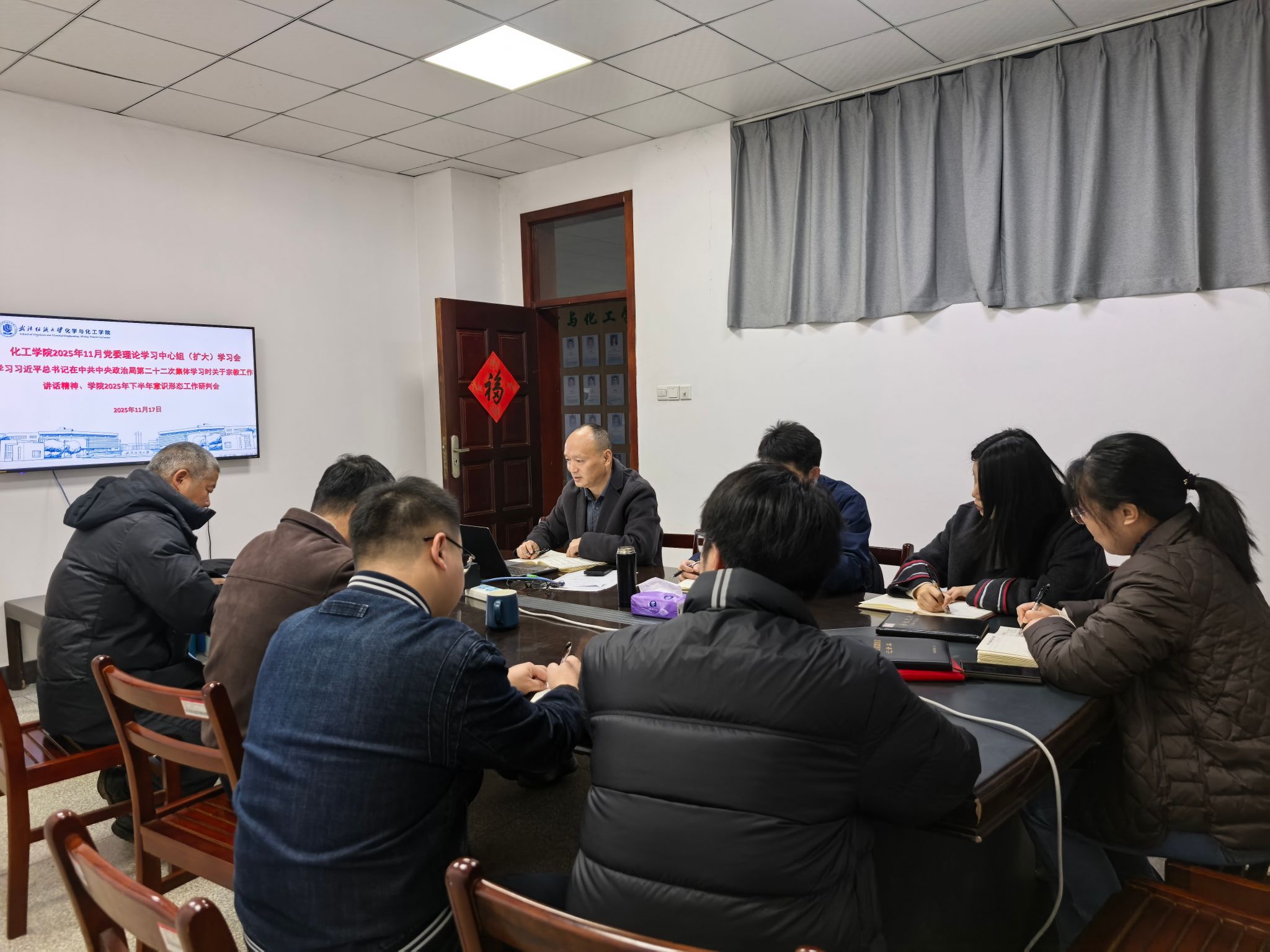 2025年11月党委理论学习中心组(扩大)学习会,学习习近平总书记在中共中央政治局第二十二次集体学习时关于宗教工作讲话精神以及学院2025年下半年意识形态工作研判会。学院领导班子成员、党委委员、全体辅导员老师出席会议,院党委书记杜勇主持会议。