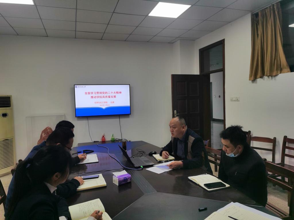 党委理论学习中心组在06--202办公室专题学习党的二十大精神。会上,杜勇书记以《全面学习贯彻党的二十大精神,推动学院高质量发展》为题全面系统地学习贯彻党的二十大精神,主要从三个方面阐述,一是提升政治站位,深刻理解学习党的二十大精神的重大意义;二是认真学习领会,全面把握党的二十大精神的主要内容与核心要义;三是坚持知行合一,推动学院高质量发展。