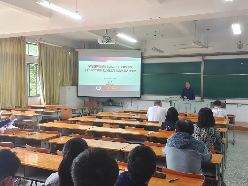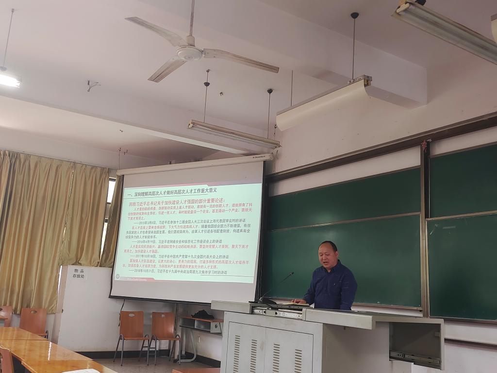 在崇礼楼210教室开展“四心聚才”高层次人才引育主题党课,全体教职工参加学习,党课由党委书记杜勇主讲。
