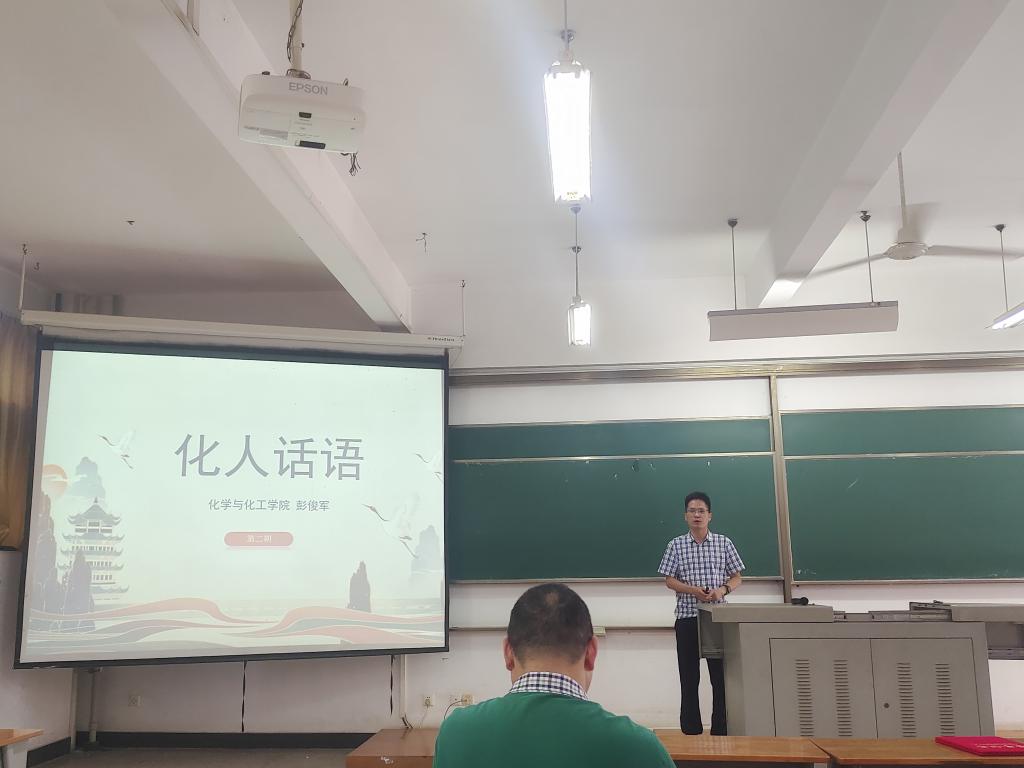 于崇礼楼212教室召开“化人话语”主题教育第二讲,主题教育由院党委书记杜勇主持,学院全体教职工参与会议,荣获学校“2022年最美教师”称号、大学化学中心支部书记彭俊军以题为《解读二十大报告中国式现代化与高等教育改革创新发展》进行讲授。