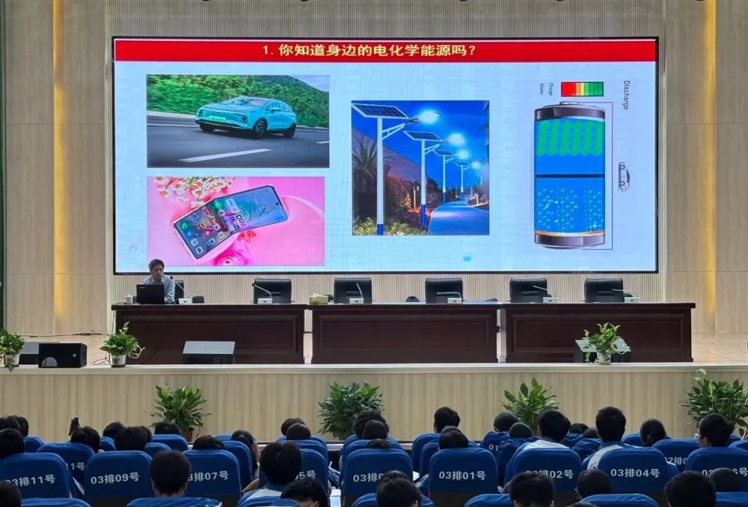 随后,彭俊军带来“揭秘电化学能源世界”主题科普讲座。他以扎实的专业知识为基础,结合生活中常见的干电池、锂电池,电动汽车的动力电池,以及未来极具潜力的新型电池等实例,通过生动形象的比喻,将复杂的电池结构与工作原理讲解得通俗易懂。讲座过程中,同学们全神贯注,眼神中满是对知识的渴望与对科学的好奇,对电化学知识有了更深刻的理解与认识。