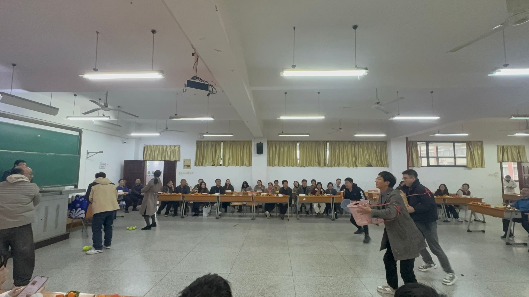表彰仪式结束后,迎新春茶话会正式拉开帷幕。学院工会精心策划组织了一系列兼具趣味性与互动性的活动,让现场氛围迅速升温。茶话会以“欢乐相聚·共启新程”为主题,设置了幸运抽奖、“扮时钟、抛锈球、五毛一块、学习武汉话”等多个趣味活动环节。幸运抽奖环节中,各种精美礼品接连送出,每次开奖都伴随着阵阵欢呼与掌声;趣味游戏环节更是精彩纷呈,“扮时钟”游戏中,参赛教职工精准模仿时钟指针角度,引得台下笑声不断;“抛绣球”游戏考验着团队协作与反应能力,大家相互配合、踊跃参与;“五毛一块”游戏中,教职工们快速组队、灵活调整,现场充满了欢声笑语;“学习武汉话”环节则极具地域特色,本土教师耐心教学,外地教师认真模仿,一句句略显生涩却充满趣味的武汉话让现场氛围愈发温馨融洽。茶话会现场摆满了水果、点心,教职工们边品尝边参与活动,畅谈工作与生活,处处洋溢着团结奋进、喜庆祥和的节日气氛。