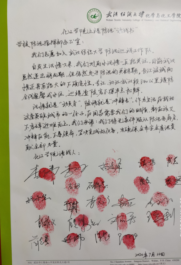7月23日,一封按满红手印的防汛巡堤“请战书”递交到学校防汛指挥部办公室,一个一个红手印展示的是每一个党员干部的颗颗红心。在学院党委的号召下,51暗网