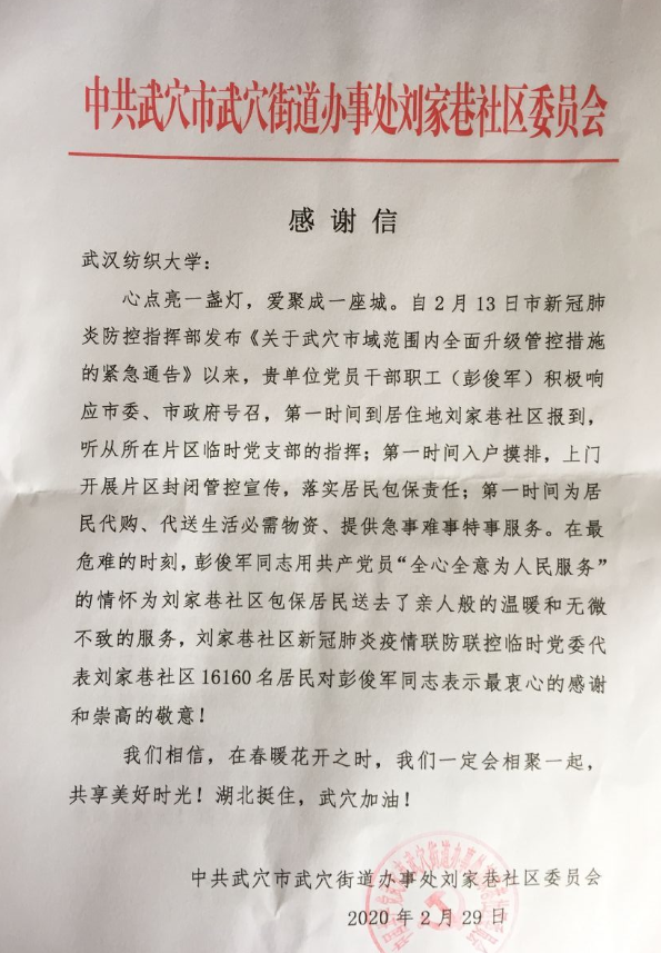 师生也通过各种途径表达自己的心意,贡献自己的力量。学院王强教授通过个人渠道,辗转国外,通过加拿大湖北同乡会捐款,从国外采购防护服等紧急医用物资定点捐赠给武汉金银潭医院,为一线医护人员送上“战衣”,体现了知识分子的家国情怀;张艳波老师春节返乡,自掏腰包为所在村乡亲们购买口罩并为孤寡老人专门购买蔬菜、牛奶、面条、卷纸等日常生活物资,体现了浓浓的乡情;李时伟老师的爱人是武汉大学中南医院ICU护士,一直在重症监护室抗疫一线,并已奔赴雷神山医院支援至今,已1个多月没有回家,李明老师的爱人也一直投身参与学校疫情防控一线,后方家人克服困难,全力支持,体现了舍小家为大家的奉献情怀;学院多名教授看到学校隔离点清理通知,积极带头报名参加,有的老师人不在武汉无法亲自参与清理,便积极多方联系,筹措购买了300瓶84消毒液捐给学校,体现了对学校的深情厚谊;青年学生也勇当志愿者,身体力行,传递真情,用自己的微行动为防控工作做贡献,力所能及做一个为爱而行的人,体现了95后、00后的担当与情怀……