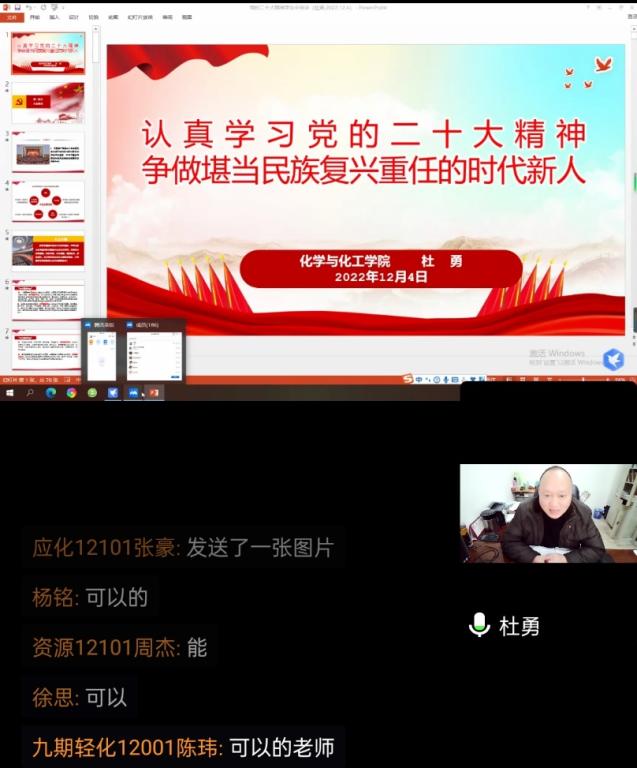 党委书记杜勇通过线上的方式以“认真学习党的二十大精神,争做堪当民族复兴重任的时代新人”为题,为学院学生党员、苦干团成员宣讲党的二十大精神。讲座中,杜勇结合自身学习体会,从党的二十大概况、过去5年的工作和新时代10年的伟大变革、马克思主义中国化时代化、以中国式现代化全面推进中华民族伟大复兴、全面建设社会主义现代化国家的目标任务、坚持党的全面领导和推进全面从严治党、应对风险挑战等7个方面,深入阐释了党的二十大的召开背景、主要内容和重大意义。