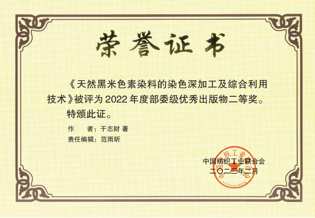 于志财特聘教授著作的《天然黑米色素染料的染色深加工及综合利用技术》荣获二等奖。该书是一部基于纺织行业“双碳”目标指引下,将天然色素用于纺织品染色及功能整理研究的新作。