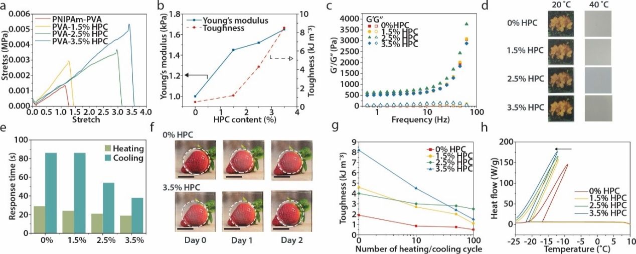 课题组进一步研究了这种物理链缠结增强技术的普遍适用性。与PNIPAm-HPC体系类似,PNIPAm-聚乙烯醇(PVA)- HPC体系在机械性、循环稳定性、响应速度和抗干燥/抗冻能力方面均有显著提高(图3a-h)。