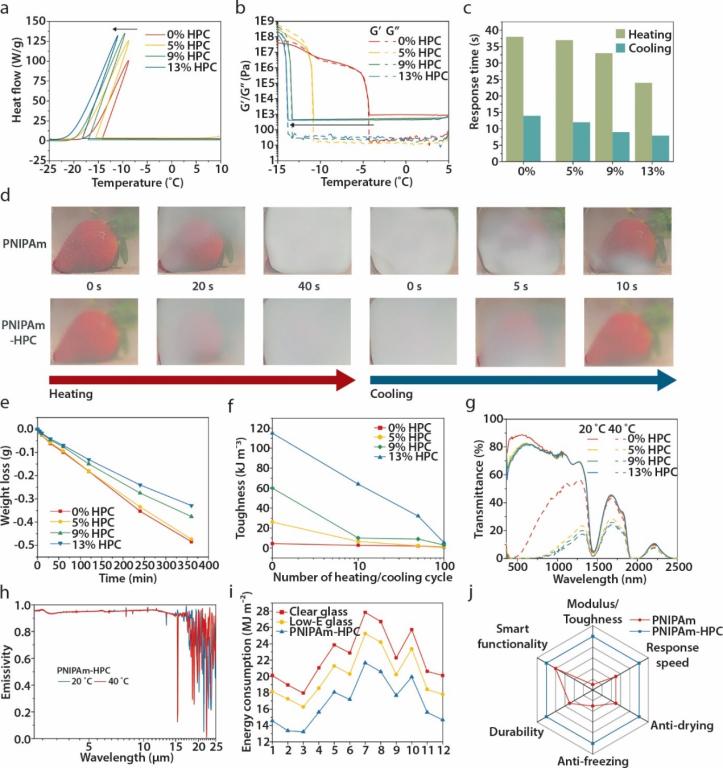 图2. PNIPAm-HPC复合水凝胶的多功能性:防冻、防干燥、智能功能、响应时间、和耐久性分析