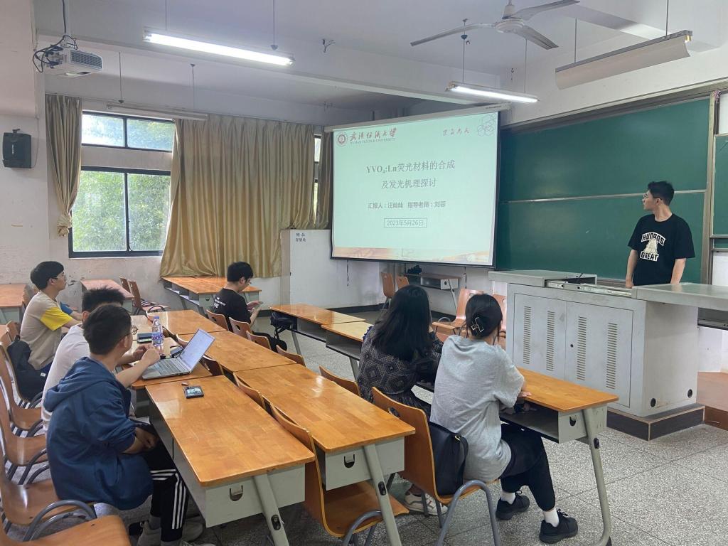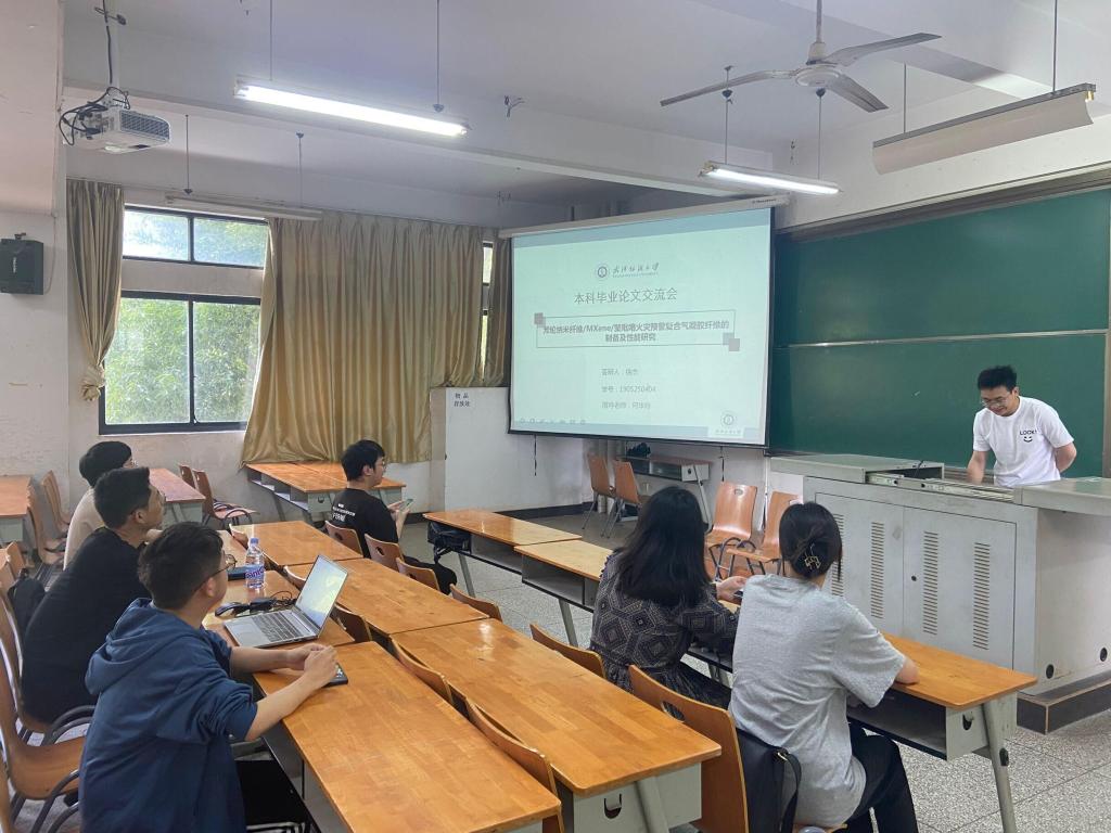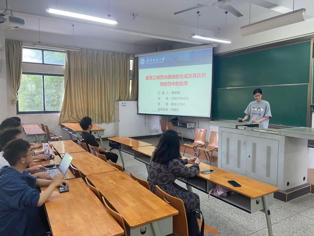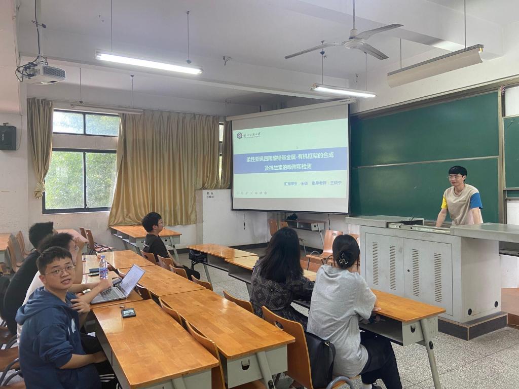 10位优秀本科毕业生作报告并展示了学术研究。容华清汇报了聚苯乙烯荧光微球的合成及其在织物防伪中的应用;肖鑫汇报了八乙酰蔗糖活化过氧化氢体系的漂白性能研究;李永明汇报了新型聚氨酯湿摩擦牢度提升剂的制备及其性能研究;徐杰汇报了芳纶纳米纤维/MXene/聚吡咯火灾预警复合气凝胶纤维的制备及性能研究;江长涛分享了顺酐酯化加氢制备1,4-丁二醇年产10万吨项目初步设计;贾子慧汇报了OMS-2/石墨片高效活化过一硫酸氢盐降解污染物的性能和机理;阮聪文汇报了双信号功能化银纳米团簇的制备及应用;沈德娇汇报了苯并噻唑类近红外染料组装体的构筑及光学性质探究;汪灿灿汇报了YVO4:Ln荧光材料的合成及发光机理探讨;王锁汇报了柔性亚砜四羧酸锆基金属-有机框架的合成及抗生素的吸附和检测。