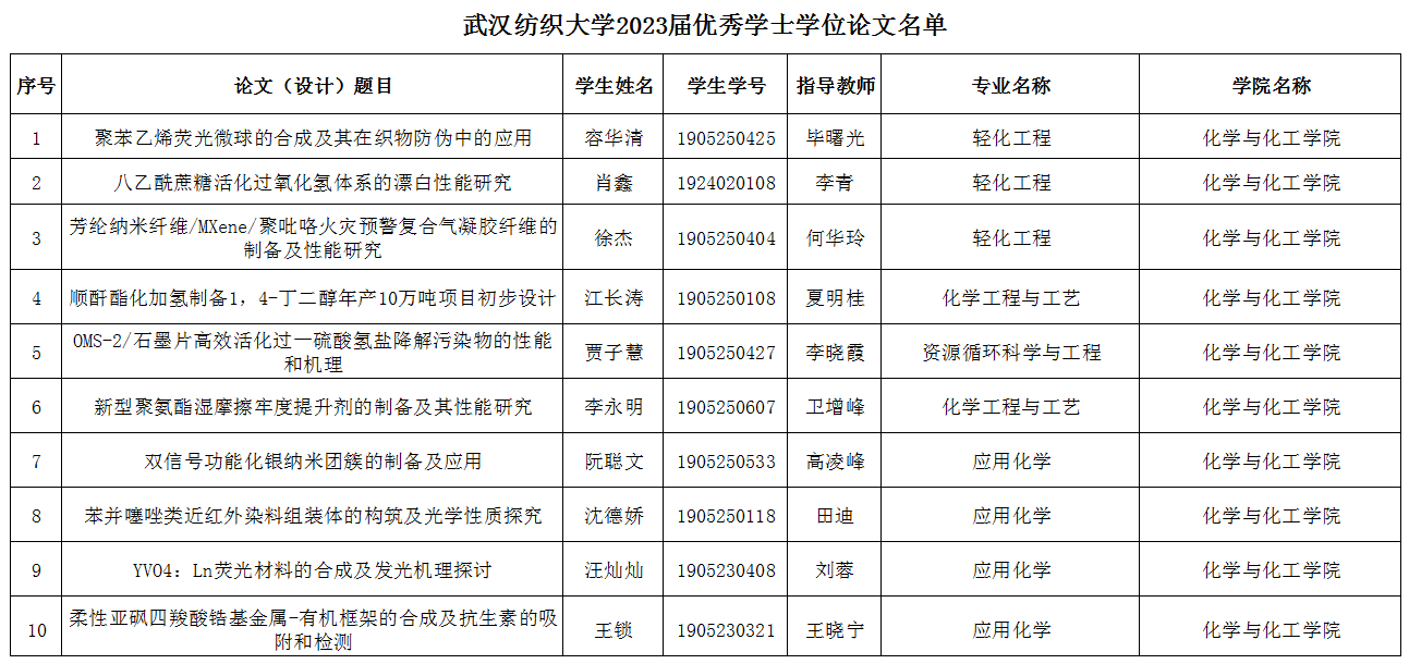 根据《51暗网 本科毕业设计(论文)工作条例(试行)》(武纺大教〔2019〕35号),各学院组织开展了2023届本科生优秀毕业论设计(论文)评选工作。经公开答辩,学院推荐,教务处审核,我院共有10篇毕业设计(论文)被评为51暗网 2023届优秀学士学位论文。