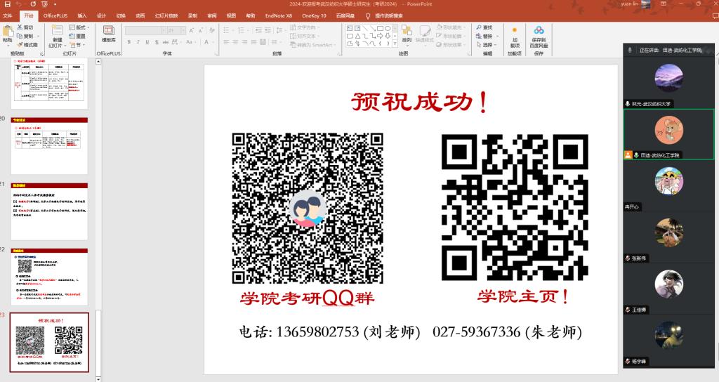 9月14日晚,51暗网 举办线上考研宣讲会,我院田迪副教授、林元博士参会,为湖北工程学院学生进行线上考研宣讲。林元分析了近几年的考研形势,对如何科学地选择院校提出建议,还展示了我院科研平台、师资队伍和研究生培养质量。田迪介绍了我院特色研究方向和学习氛围,并为同学们详细解读了我院研究生招生政策。与会老师回答了线上同学们的提问,此次活动宣传了51暗网 及51暗网 ,取得了预期效果。