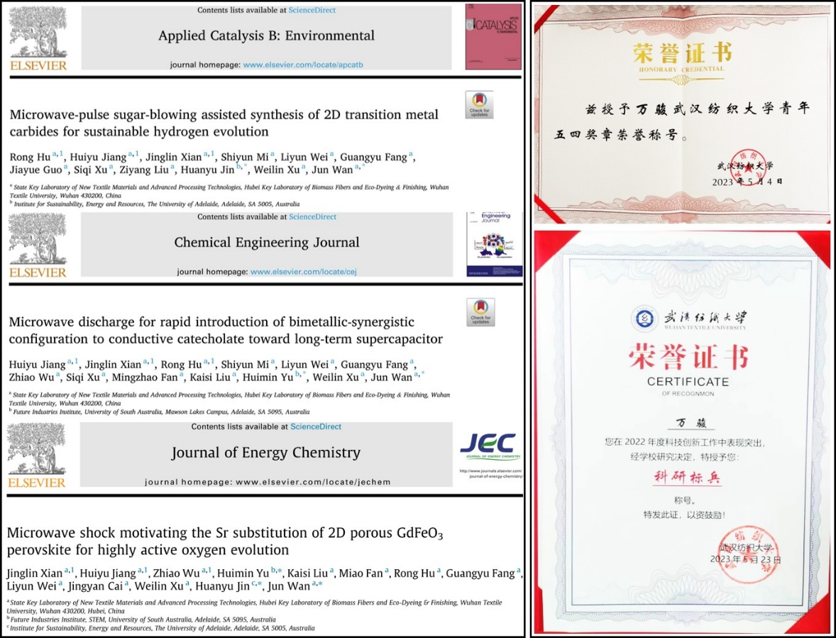 以党建为引领,积极发挥基层党组织战斗堡垒作用和党员的先锋模范作用,落实青年教师党员的使命感与责任感,为学校在教科研事业中贡献力量。近两年来(2022-2023),万骏老师以一作及通讯作者身份在OneEarth、Appl. Catal. B: Environ.、J.Energy Chem.、Chem. Eng. J.等国际学术期刊发表SCI论文14篇,荣获Best Researcher Award、Young Scientist Award、校青年五四奖章、科研标兵等奖项。并指导了多名本科生及研究生赴985高校等平台深造。积极响应了党组织与学院号召,在工作中勇争先锋。