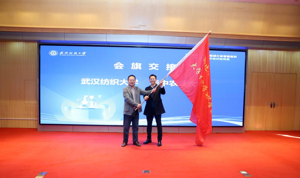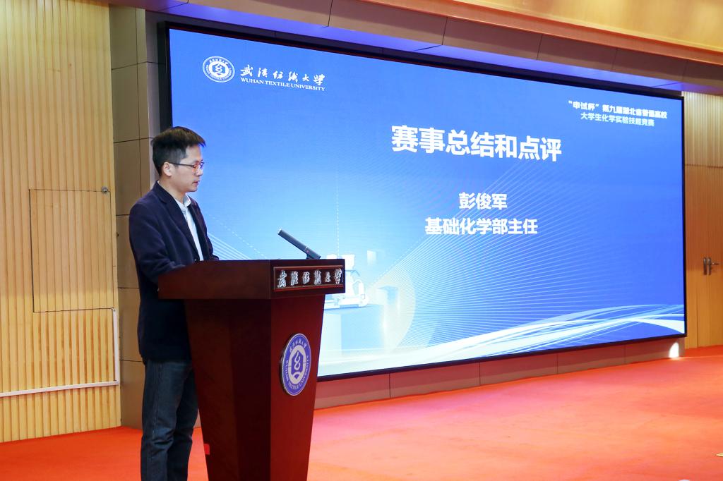 基础化学部主任彭俊军进行了赛事总结点评,他指出,大赛旨在引导本科生积极参与实验教学建设,契合教学改革需求,构建教师主导、学生参与的创新模式,促进实验教与学的相互促进,实现教学相长,同时针对实验中普遍存在的操作不规范、严谨性不足等问题提出改进建议。紧接着由陈飞飞宣布获奖名单,最后湖北省化学化工实验教学示范中心联席会张海波宣布下一届承办单位,进行会旗交接。下届湖北省大学生化学实验竞赛将由华中农业大学承办。