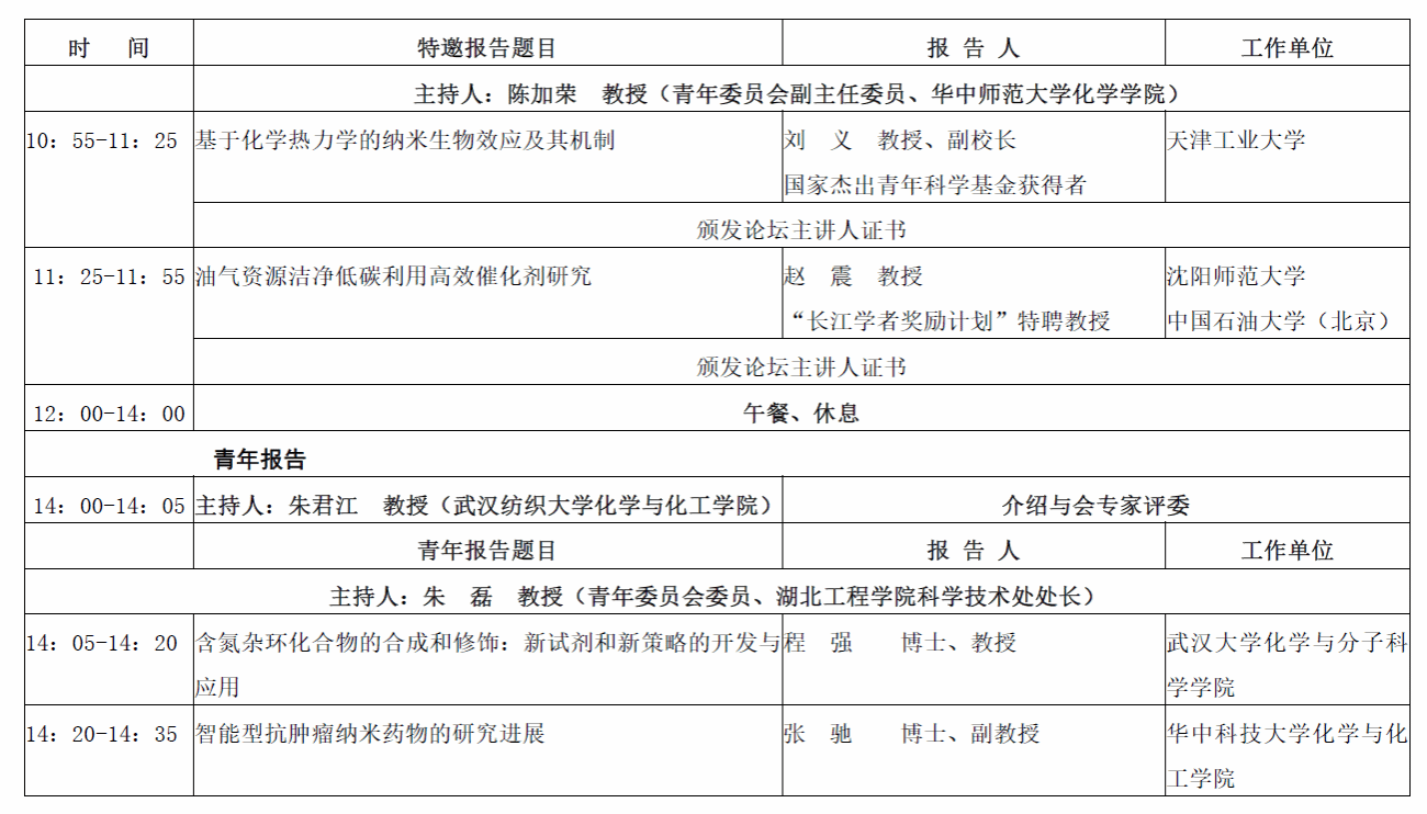 论坛邀请了天津工业大学副校长刘义教授、江苏科技大学副校长施伟东教授、沈阳师范大学赵震教授、清华大学王定胜教授、华中科技大学夏宝玉教授进行了大会特邀报告。武汉大学程强教授、华中科技大学张弛副教授、武汉工程大学杨欢副教授等14位青年专家学者作了青年报告。