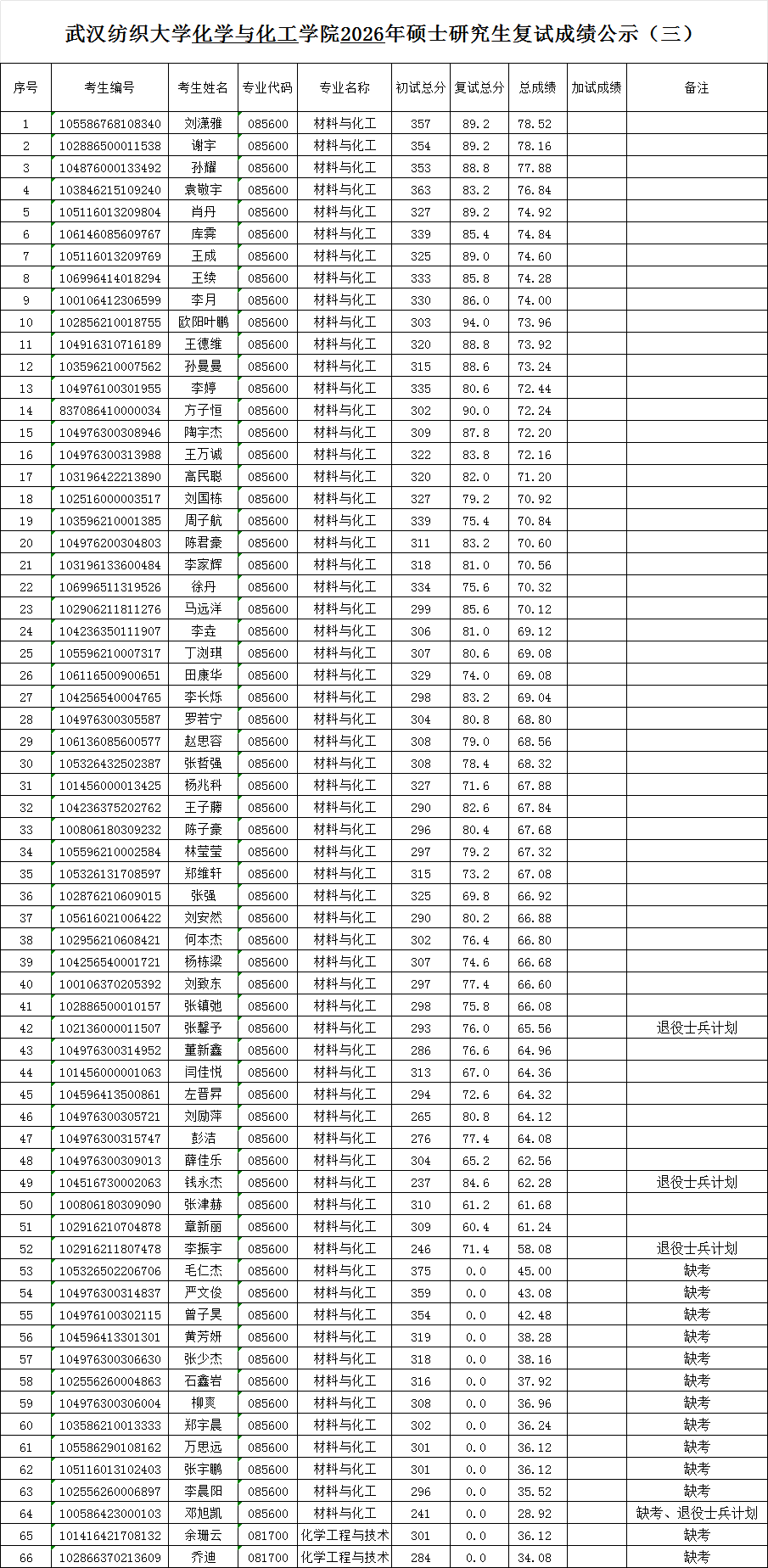 公示时间:2026年4月9日-11日。如对公示成绩有异议,在公示期内,可据实向化学与化工学院办公室反映。电话:朱老师 027-59367336