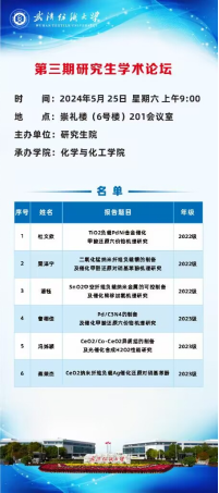 2024年5月25日上午9点,我院在6号教学楼201会议室举行了2024年度第3期研究生学术论坛。刘丽君教授、林元博士、研究生及本科生代表二十余人参会。22级研究生杜文欣、潘钰、栗泽宁和23级研究生冯姊颖、蔡荣杰、曹栩佳分别进行了报告,介绍了负载型催化剂的制备及其在催化机理研究。