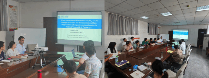Khan博士详细介绍了锰基催化材料设计与有机污染物降解机制研究方面的工作,重点探讨了过硫酸盐和亚硫酸盐活化体系在污染物处理中的应用。报告结束后,Khan博士对与会师生提出的关于催化材料设计原理、污染物降解效率等问题进行解答,现场学术氛围浓厚。