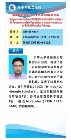 Aimal Khan,长期从事锰基催化材料的设计合成,构建了基于过硫酸盐和亚硫酸盐活化体系降解多种有机污染物,研究环境污染物的降解机理,发表了35篇研究论文,被引用超过2700次(H-Index27-Googlecholar),主持科技部外国青年项目1项,参与国家自然科学基金2项,担任Molecules(ISSN1420-3049)的客座编辑。