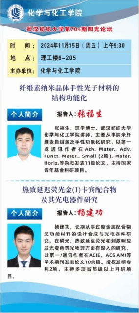 在阳光校区6号教学楼205会议室举办学校第704期阳光论坛。本次论坛上,张福生博士和杨建功副教授分别作题为“纤维素纳米晶体手性光子材料的结构功能化”和“热致延迟荧光金(Ⅰ)卡宾配合物及其光电器件研究”的报告。学院教师及研究生代表参与了此次论坛。