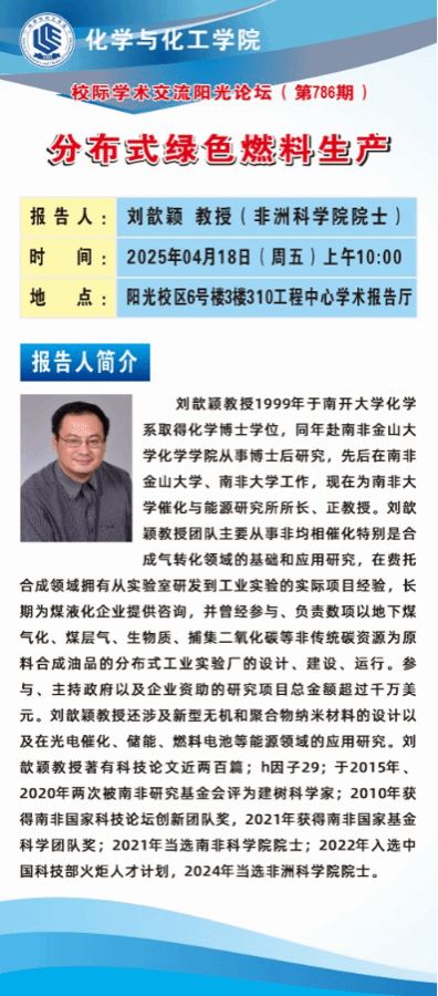 刘歆颖教授1999年于南开大学化学系取得化学博士学位,同年赴南非金山大学化学学院从事博士后研究,先后在南非金山大学、南非大学工作,现在为南非大学催化与能源研究所所长、正教授。刘歆颖教授团队主要从事非均相催化特别是合成气转化领域的基础和应用研究,在费托合成领域拥有从实验室研发到工业实验的实际项目经验,长期为煤液化企业提供咨询,并曾经参与、负责数项以地下煤气化、煤层气、生物质、捕集二氧化碳等非传统碳资源为料合成油品的分布式工业实验厂的设计、建设、运行。参与、主持政府以及企业资助的研究项目总金额超过千万美元。刘歆颖教授还涉及新型无机和聚合物纳米材料的设计以及在光电催化、储能、燃料电池等能源领域的应用研究。刘歆颖教授著有科技论文近两百篇;h因子29;于2015年、2020年两次被南非研究基金会评为建树科学家;2010年获得南非国家科技论坛创新团队奖,2021年获得南非国家基金科学团队奖;2021年当选南非科学院院士;2022年入选中国科技部火炬人才计划;2024年当选非洲科学院院士。