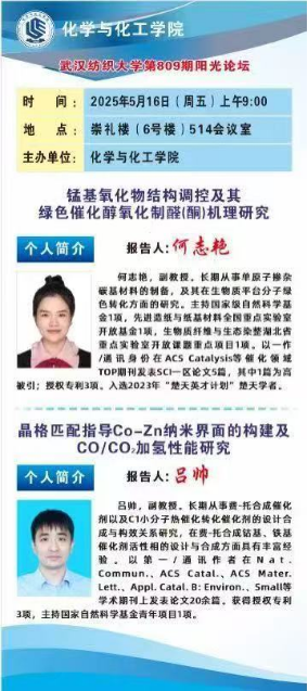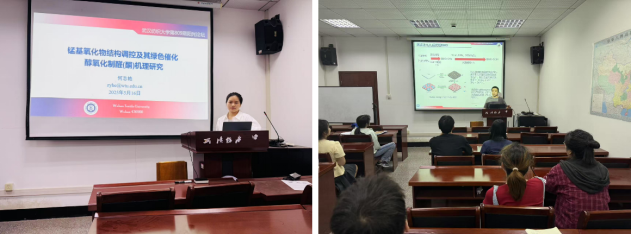 何志艳的汇报题目是“锰基氧化物结构调控及其绿色催化醇氧化制醛(酮)机理研究”,主要介绍了通过优化MnO2形貌,表面改性界面结构等方式提升其催化醇氧化制醛的性能以及机理研究。吕帅做了题为“晶格匹配机制指导Co-Zn纳米界面构筑以及CO/CO2加氢催化性能研究”的报告,主要介绍了利用六方晶型CoO和ZnO之间的晶格匹配度设计高性能的用于碳一小分子催化转化的催化剂方面的相关研究。
