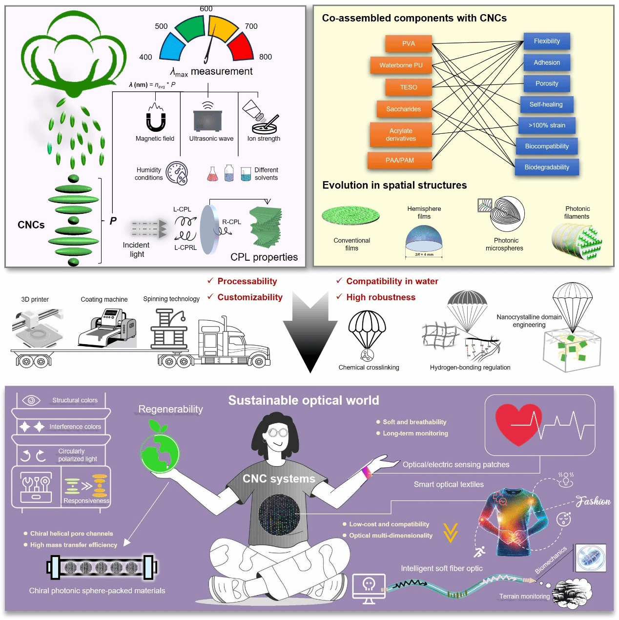 纤维素纳米晶体(CNC)作为一种绿色可再生的纳米材料,具有优异的手性光学性能与结构色效应,在光子晶体、传感器件和光学防伪等领域展现出重要潜力(图1)。然而,其固有的亲水性和力学脆性制约了其在潮湿及力学负载环境下的实际应用。本综述系统梳理了近年来通过基质工程策略提升CNC材料环境稳定性与力学性能的研究进展。