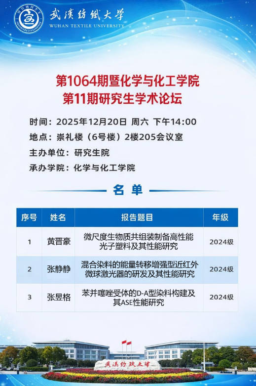在学术报告环节,三位2024级研究生围绕光功能材料与有机光电器件等研究方向作了专题汇报。黄晋豪以“微尺度生物质共组装制备高性能光子塑料及其性能研究”为题,介绍了生物质材料在微尺度结构构筑及光学性能调控方面的研究思路与实验进展;张静静围绕“混合染料的能量转移增强型近红外微球激光器的研发及其性能研究”,系统阐述了能量转移机制在提升近红外激光性能中的关键作用;张昱格则以“苯并噻唑受体的D-A型染料构建及其ASE性能研究”为报告主题,重点分析了分子结构设计对放大自发辐射性能的影响规律。