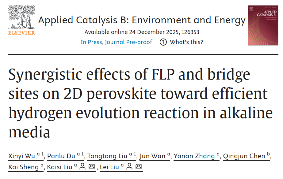 刘磊教授团队在国际知名期刊《Applied Catalysis B: Environment and Energy》发表了题为 “Synergistic effects of FLP and bridge sites on 2D perovskite toward efficient hydrogen evolution reaction in alkaline media”的研究论文(论文链接://doi.org/10.1016/j.apcatb.2025.126353)。