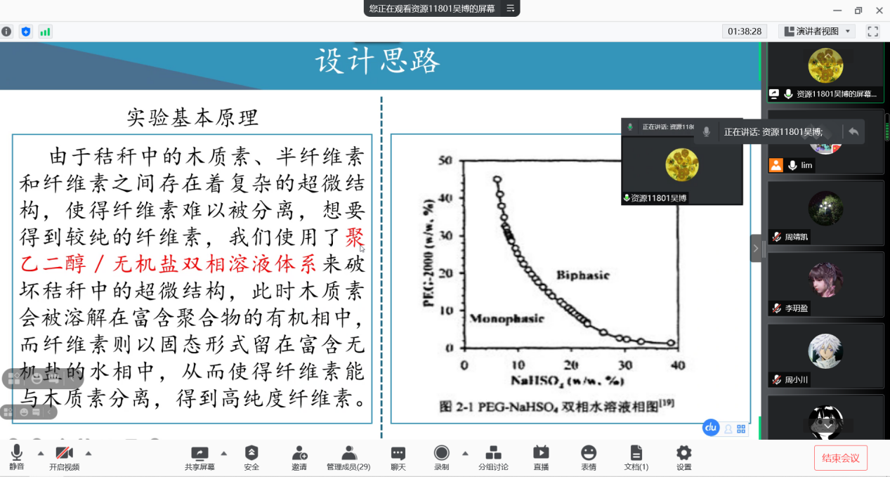 吴博作了题为“利用玉米秸秆制备纤维素薄膜的探索”,报告分析了饥饿感的主要成分及实验的基本原理,经过脱蜡—脱半纤维素—脱木质素—纤维素溶解—成膜,制备纤维素薄膜。